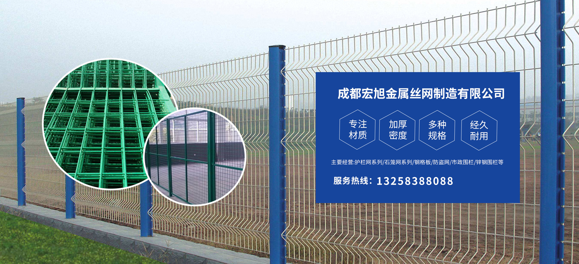 成都宏旭金屬絲網(wǎng)制造有限公司主營護欄網(wǎng)系列、石籠網(wǎng)系列、鋼格板、防盜網(wǎng)、市政圍欄、鋅鋼圍欄、鋼筋網(wǎng)片、聲屏障系列、波形護欄板、柔性纜索護欄、SNS邊坡防護網(wǎng)等其他絲網(wǎng)類產(chǎn)品。特殊規(guī)格可加工定做,也可根據(jù)客戶來圖來樣定做。自創(chuàng)業(yè)以來,公司一直堅持市場為導(dǎo)向,以客戶為根本,以實業(yè)為基礎(chǔ),以技術(shù)為支持,以科研為后盾,集科研、生產(chǎn)、經(jīng)營為一體,不斷研制開發(fā)新產(chǎn)品,開拓市場,走綜合發(fā)展之路。多年來,公司憑借過硬的質(zhì)量,良好的信譽、優(yōu)質(zhì)的服務(wù)、合理的價格,贏得了市場和商家的一致好評。
